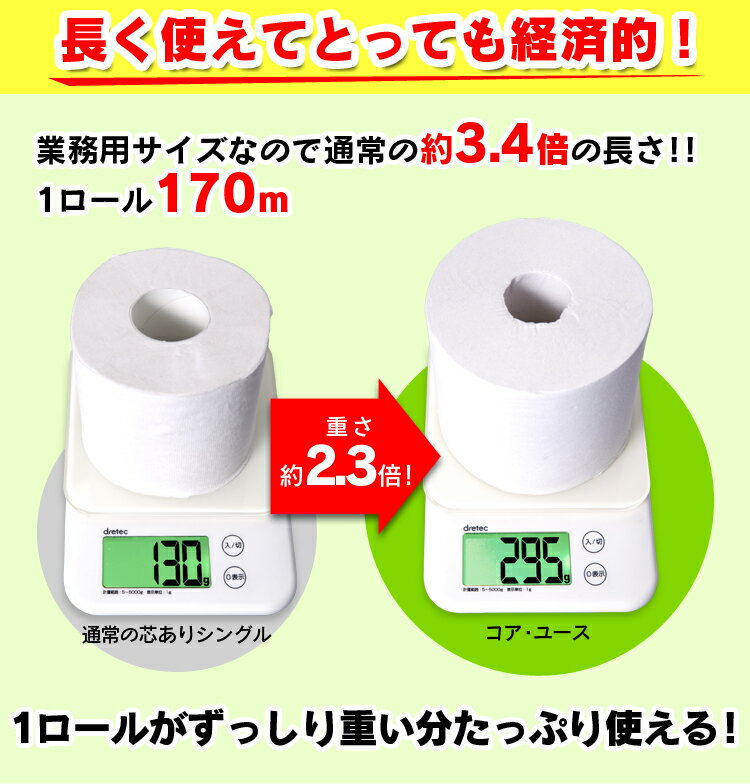 トイレットペーパー 芯なし 48ロール(6ロール×8パック)コアレストイレットペーパー ホワイト送料無料 170m 業務用 家庭用 シングル 芯なしシングル 再生紙 エコ 古紙 トイレ 便所 収納