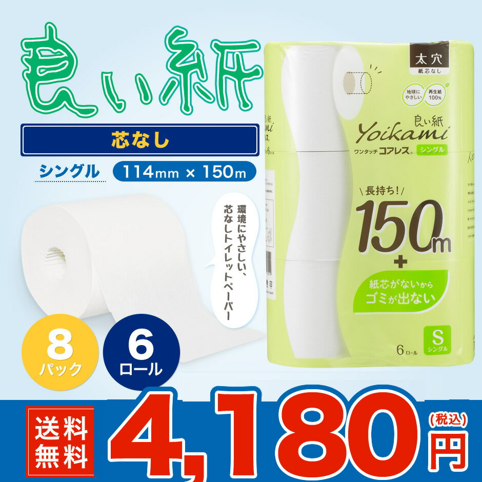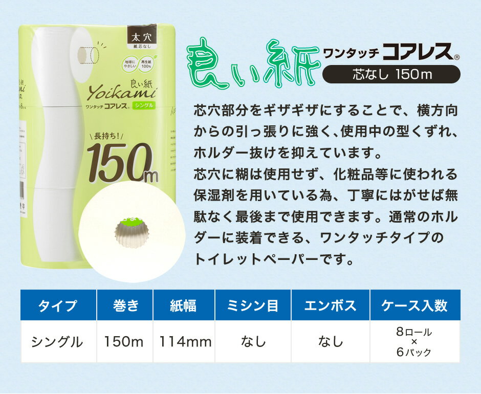 【良い紙ワンタッチコアレス114mm幅 150m巻 芯なし 6R 8パック 太穴 シングルトイレットペーパー】 送料無料 まとめ買い 家庭用 業務用 最後まで使える 超ロングタイプ 通常の3倍 長巻き 日用品 災害用 備蓄 長持ち 節約 再生紙 大阪発 エコ メーカー直送