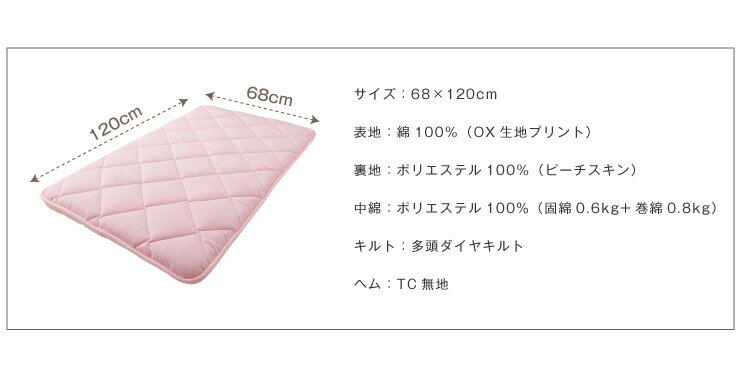 【商品名】三層固綿入りごろ寝マット 68×120cmタイプ【サイズ】68×120cm【表地】綿100%(OX生地プリント)【裏地】ポリエステル100%(ピーチスキン)【中綿】ポリエステル100%(小:固綿0.6kg+巻綿0.8kg)【キルト】多頭ダイヤキルト【ヘム】TC無地【厚み】約5〜7cm(部分によって若干の差異がございます)【送料について】北海道、沖縄、離島は別途送料を頂きます。