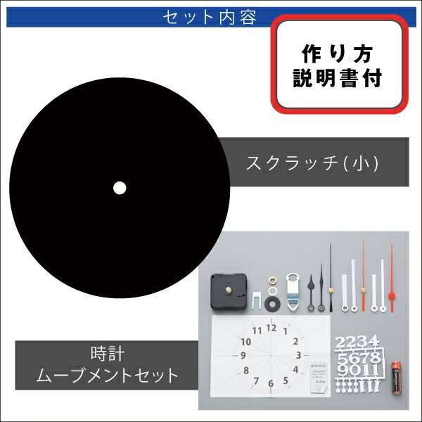 ■セット内容 ◇スクラッチ板(飾り板) 本体サイズ:直径168×厚み1(mm) (表面:黒塗り加工(削り面) 裏面:白塗り) ◇時計ムーブメントセット ・クォーツ時計本体(厚み16mm)…1 ・時計針(分針、短針、秒針セット)…3 ・プラスチック製文字符・…1 ・ナット…1 ・ワッシャー…1 ・ゴムパッキン…1 ・12分割台紙(型抜き加工済)…1 ・専用ドライバー…1 ・単三乾電池…1 ・吊り金具…1 ■必要な道具 ニードルorカッターナイフ、科学接着剤 ☆